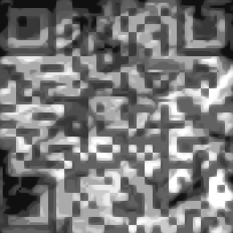 We can use GIMP or any similar tool. Let’s use Filters / Enhance / Noise Reduction, strength 32, to smooth the pixels. Another filtering with Colors / Tone Mapping / Mantiuk 2006, contrast 1.0, saturation 0.0, and we increase local contrast. The core structure of the QR code became clearer.